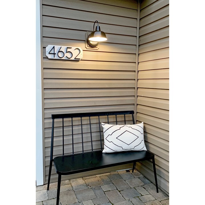 Our front stoop needed a little makeover. It was bland and not very welcoming. So the first thing we did was add our house numbers. We then replaced the light with a modern one, painted the door matte black, tore out an old bush, and added a cute bench. The makeover was a quick, cheap, and easy upgrade. Now I can finally enjoy my evenings out here!