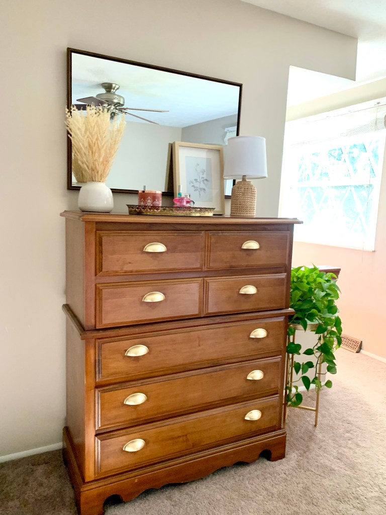 My aunt kindly gifted us this dresser when we bought our house. I love it and it’s such a solid piece of furniture. To better match our decor, I upgraded the hardware with a more modern look. I bought these drawer pulls off of Amazon. Unfortunately, I was having some trouble finding the right size screw to fit the pulls, so I had to add some nuts and washers in order to get the screw tight.