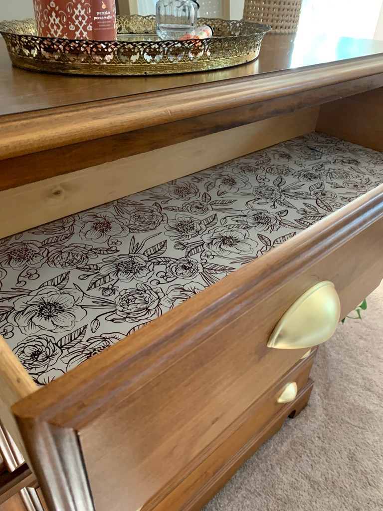 I also lined the dresser’s drawers with some wrapping paper to give it a finishing touch. I secured the wrapping paper with Tic ‘N Stik. I linked the supplies that I used below.