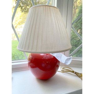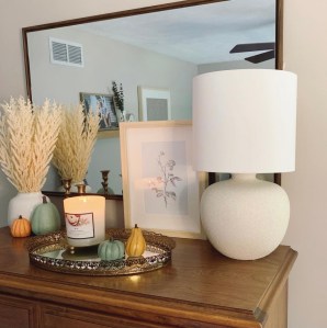 I first spray-painted it white for a base layer to hide the bright red and added textured paint on top. The painting took a few coats. Once dry, I removed the tape and plastic and added a light bulb along with a new lampshade. I used a lampshade from a lamp I wasn’t using anymore, but you can find high-quality shades at a reasonable price at Target. I’ll link to an example below.