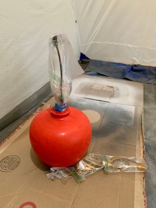 I first made sure the light worked! I then cleaned the lamp and removed the old lampshade. Next, I covered up the lamp using pre-taped painter’s plastic, so just its base was exposed. Next, I sanded the lamp’s base with fine-grit sandpaper for the spray paint to have something to grip to.